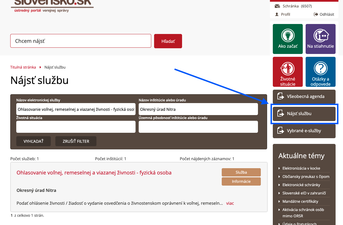 Následne treba v sekcii "Nájsť službu" dať vyhladávať službu a zvoliť si Okresný úrad podľa príslušnosti.