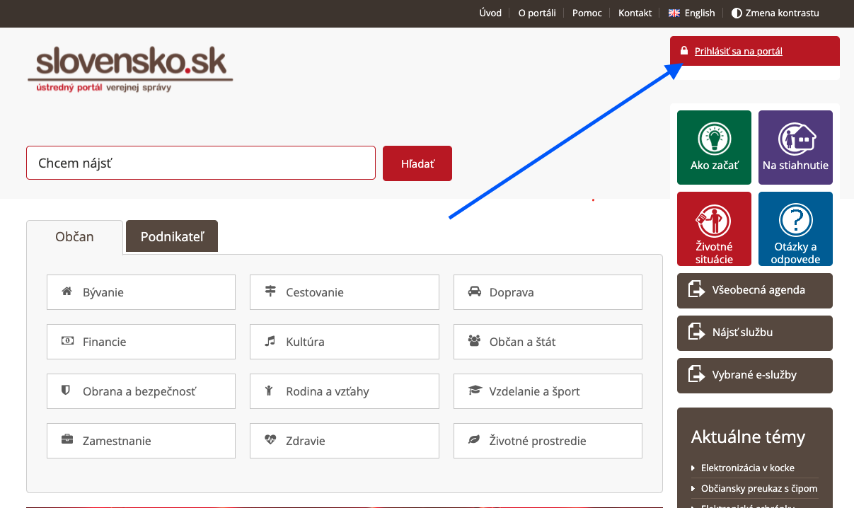 Prostredníctvom občianskeho preukazu a zadania bezpečnostného osobného kódu sa prihlásite na portál www.slovensko.sk.