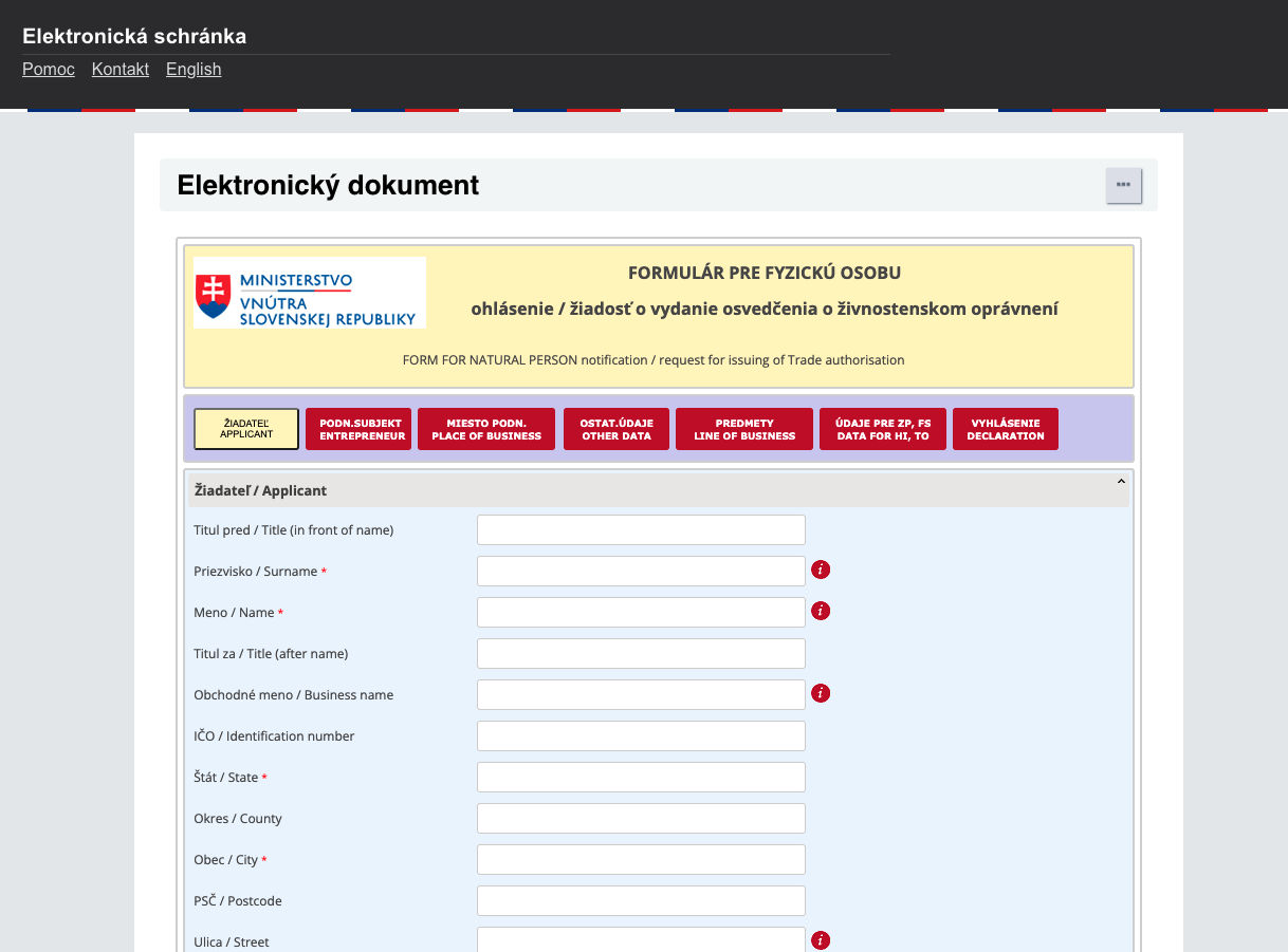 Následne kliknete na službu: Ohlásenie voľnej, remeselnej a viazanej živnosti - fyzická osoba a zobrazí sa vám príslušný formulár na vyplnenie.